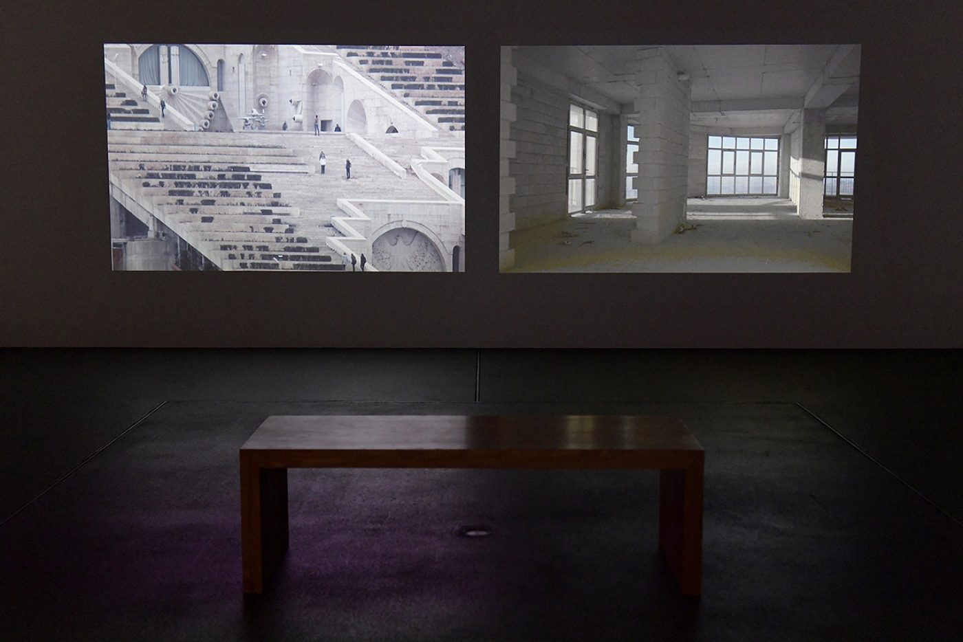 Sebastian Stadler (*1988, lebt und arbeitet in Wil und Zürich) hat an den Kunsthochschulen in Lausanne und Zürich Fotografie studiert. Die fotografische Bildproduktion, die damit einhergehenden technischen Verfahren, aber auch die Distribution und Rezeption von Bildern in der digitalen Gegenwart treiben ihn um. Dabei nutzt er beispielsweise gefundene Webcam-Bilder und historische Fotografien aus Archiven – wie jüngst jene aus dem Archiv von Feuerwehr, Zivilschutz und Rettungsdienst der Stadt Wil, die er im Rahmen einer Kunst-und-Bau-Arbeit im Siebdruckverfahren auf die Wand appliziert hat – oder er arbeitet mit analoger Kamera und mehrfach belichteten Filmen. Aus diesem fotografischen Standpunkt interessiert sich Sebastian Stadler auch für bewegte Bilder. Die langsamen Kamerafahrten und statischen Einstellungen seiner Videoarbeiten referieren eindeutig auf die Fotografie. Apartment Ararat (2018) – der Titel ist einer Airbnb-Anzeige entnommen – zeigt verschiedene Blicke und Perspektiven aus der armenischen Hauptstadt Jerewan auf den Ararat. Der über 5000 Meter hohe Berg liegt lediglich 20 Kilometer von der Stadt entfernt, jedoch auf türkischem Staatsgebiet. In Armenien verehrt – an seinen Hängen soll nach biblischer Tradition Noahs Arche gelandet sein – bleibt der Berg für die Armenier*innen unerreichbar, ist doch die türkisch-armenische Grenze seit Jahren geschlossen. In Apartment Ararat sehen wir den heiligen Berg als verschwommene Silhouette hinter den Hochhäusern, als dunkles, so nahes wie unerreichbares Wahrzeichen, das sich über dem nächtlichen Jerewan erhebt.