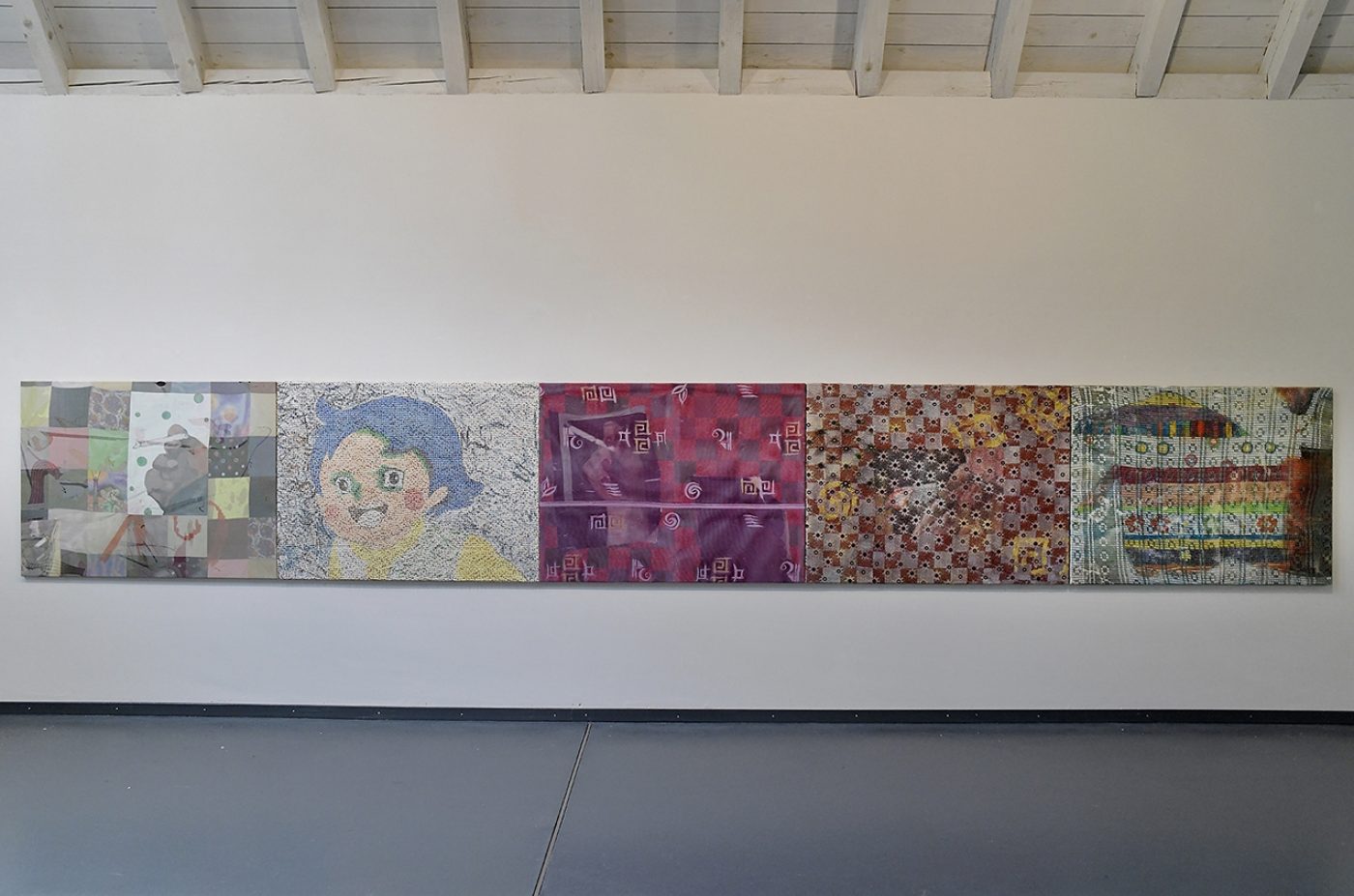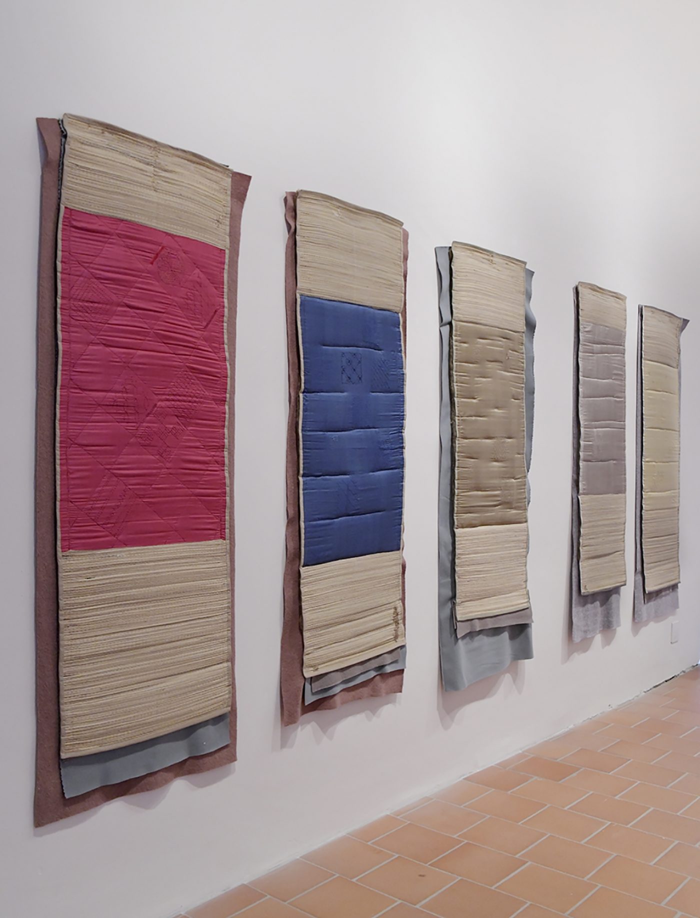 Care-Arbeit – die bezahlte und unbezahlte Familien-, Betreuungs- und Hausarbeit, die im häuslichen Bereich wie auch in öffentlichen oder privatwirtschaftlichen Institutionen als Dienstleistung erbracht wird – ist seit den 1970er-Jahren immer wieder Gegenstand der feministischen Debatten. Meist von Frauen und insbesondere von Migrantinnen verrichtet, ist sie zwar Grundlage der kapitalistischen Marktwirtschaft, jedoch oft gar nicht oder schlecht bezahlt. Dementsprechend pochen die feministischen Forderungen nicht nur auf faire Entlohnung, sondern auch auf Anerkennung und Wertschätzung von Care-Arbeit. Brigitte Buchholz (*1957, lebt und arbeitet in Kreuzlingen) schliesst mit ihrer an der Werkschau gezeigten Serie der Futterale (2019) an diesen Diskurs an. Die aus textilen Materialien und einer Strandmatte gefertigten Objekte erinnern an Futons und können sowohl in offener Form als auch zusammengerollt präsentiert werden. Die Motive, die in der einfachen Vorstichtechnik der japanischen Sashiko-Stickerei appliziert sind, erinnern nicht nur an tradierte Näharbeiten beispielsweise zum Ausbessern von Kleidung, sondern verweisen auch darauf, dass Care-Arbeit emotionale Arbeit ist, die genauso die Pflege von Beziehungen wie die Planung von Geburtstagen, Ehe oder Fruchtbarkeit umfasst. Brigitte Buchholz, selbst als Künstlerin und auch als Pflegefachfrau ausgebildet, nennt die Futterale auch ‚verlässliche Orte’ und spielt damit auf die häusliche Geborgenheit an. Buchholz will mit ihrem künstlerischen Schaffen die meist im Verborgenen verrichtete Care-Arbeit sichtbar machen und für das Thema sensibilisieren.