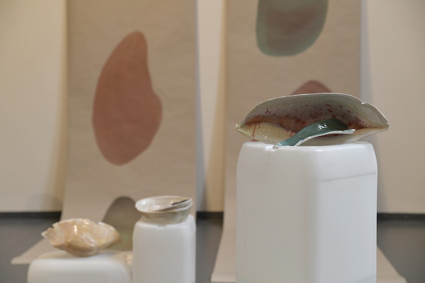 Stefanie Koemeda (*1987, lebt und arbeitet in Ermatingen und Wien) hat an der ETH Zürich molekulare Pflanzenbiologie studiert und an der Universität für angewandte Kunst Wien einen Master in Art & Science absolviert. In ihrer künstlerischen Praxis verbinden sich diese Interessen. Sie arbeitet mit künstlichen Materialien wie Schaumstoff oder Flaschenglas und entwickelt daraus vermeintlich organisch wirkende Formen, sie nutzt natürliche Stoffe wie Ton und Sand oder spielt mit dem Täuschungsmoment von Fellimitaten und Kunstleder. Dabei beschäftigt sich die Künstlerin mit der Frage, inwieweit die Unterscheidung zwischen ‚natürlich’ und ‚künstlich’ sinnvoll ist – gerade im Kontext des Anthropozäns, also des gegenwärtigen von menschlichen Eingriffen geprägten Erdzeitalters. Die an der Werkschau gezeigte Arbeit Liebe aus Plastik (2019) besteht aus Inkjetprints und Figuren aus eingefärbter Keramik, die sie als installatives Setting ortsspezifisch anordnet. Die Farbigkeit steht in einem Kontrast zur Tatsache, dass die Objekte und Prints angelehnt sind an die Muster und Formen von angeschwemmten Gegenständen, die Stefanie Koemeda an den Stränden verschiedener Küstenregionen gefunden hat. Dabei referiert wohl auch das Wort ‚Liebe’ im Titel mehr auf die anhaltende Beliebtheit von Plastik – als Müllsäcke, Flaschen oder Flipflops – denn auf pastellfarbene Romantik. Der Plastikmüll, der tonnenweise in den Weltmeeren landet, kann sinnbildlich für das Anthropozän stehen und stellt zugleich ein drängendes Umweltproblem dar. Stefanie Koemeda erinnert uns mit ihrer Arbeit daran.