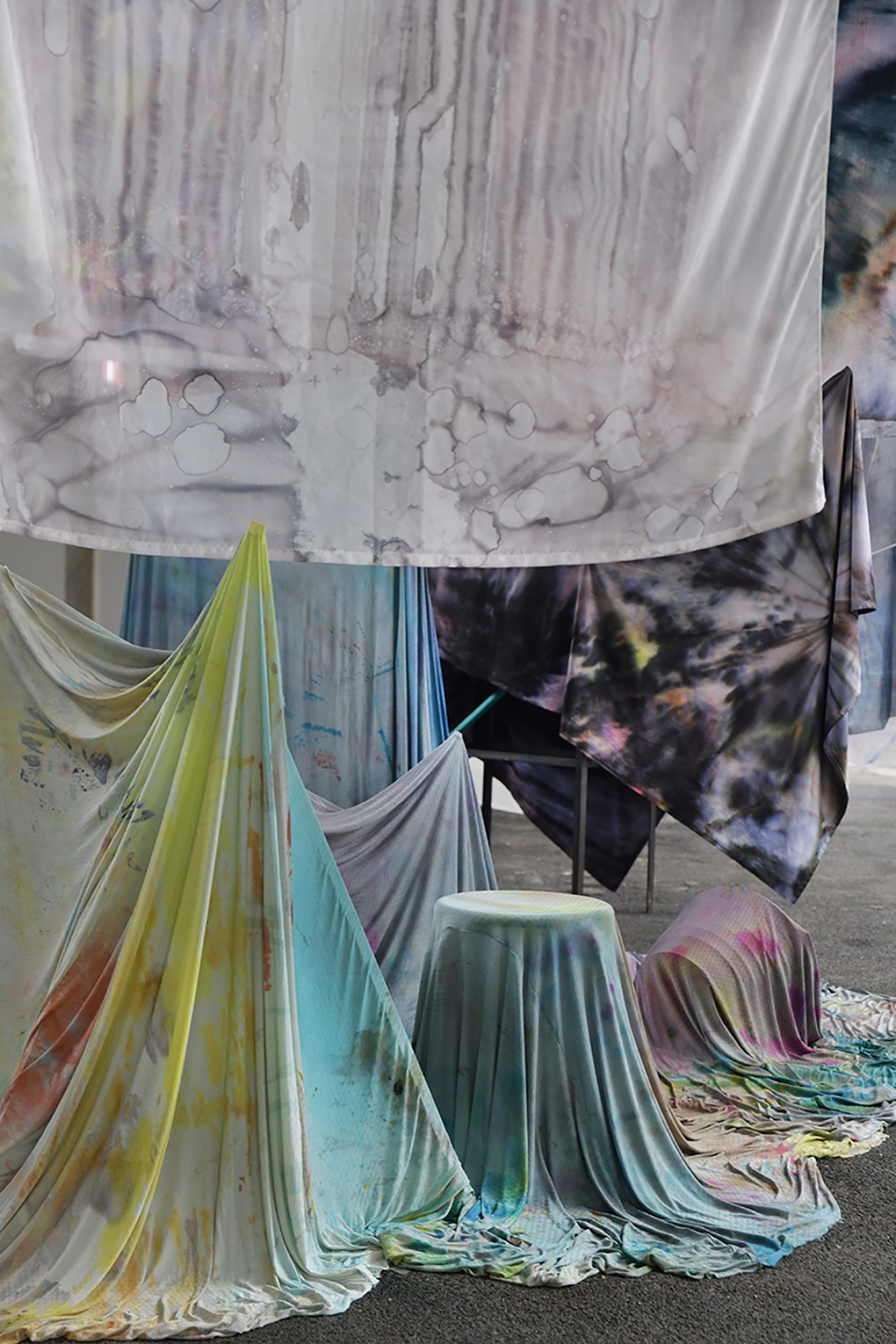 Lika Nüssli (*1973, lebt und arbeitet in St. Gallen) ist ausgebildete Textildesignerin und hat an der Hochschule Luzern (HSLU) Illustration studiert. Sie zeichnet, malt, illustriert, entwickelt skulpturale Arbeiten und Performances. Im Sommer 2019 ist sie mit der Initiative NomadLab in einem alten Postauto quer durch die Schweiz unterwegs und inszeniert von Musik begleitete Performances. Dabei fertigt sie grosse Zeichnungen und bearbeitet Stoffe, indem sie diese mehrfach einfärbt und die Farbe immer wieder auswäscht. Ihr Körper ist mittendrin, sie interagiert mit den Materialien, die Farben hinterlassen Spuren an den Beinen und auf den Händen. Für die Werkschau konzipiert Lika Nüssli eine auf die Architektur der Kunsthalle Arbon adaptierte Inszenierung ihrer Installation New Ghosts. Mehrere Lagen von gefärbten nassen Tüchern sind über verschiedene Objekte gehängt, verdecken diese, färben sich gegenseitig ein, hinterlassen Abdrucke und Flecken. Für Lika Nüssli ist diese Arbeit sowohl eine Möglichkeit, ihre verschiedenen Methoden zusammenzubringen, als auch eine Konfrontation mit ihren künstlerischen Prozessen: „Für mich steht das Einfärben für die Auseinandersetzung mit der Geschichte, der Erinnerung, dem Geschehenen und das Bleichen für das Loslassen, die Vergänglichkeit, die Auflösung, den Neubeginn“, sagt die Künstlerin. Zugleich bergen diese ‚neuen Geister’ auch eine politische Dimension. In ihrer Erscheinung an barocke Faltenwürfe erinnernd, visualisieren sie die Idee des Verdeckens und Verbergens. Sie sind, so Lika Nüssli, in diesem Sinne auch ein metaphorischer Verweis auf die komplexen, bisweilen undurchschaubaren Strukturen einer globalisierten Welt, die von uns mehr denn je aktives politisches Handeln verlangen.