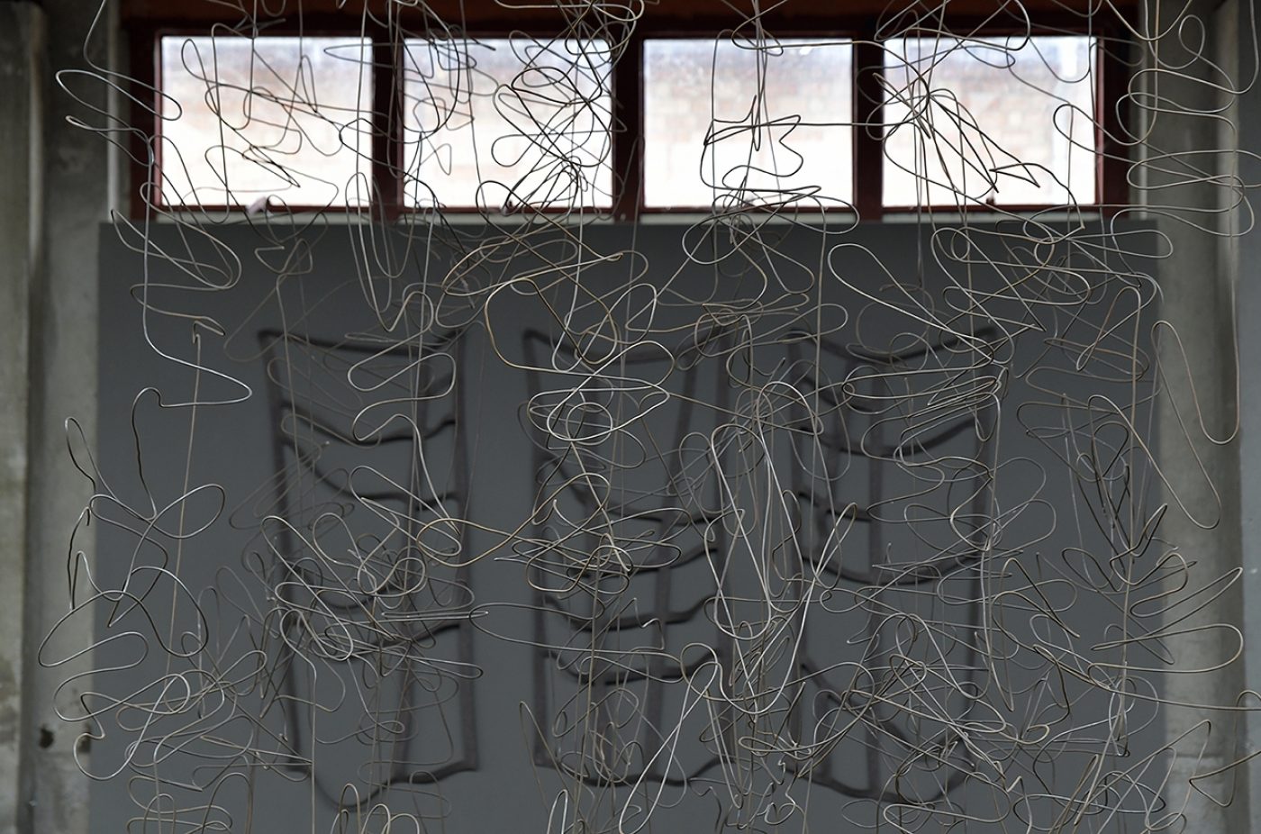 Lucie Schenker (*1943, lebt und arbeitet in Gottlieben und St. Gallen) ist ausgebildete Textilentwerferin und war bis Ende der 1960er-Jahre in diesem Beruf tätig. Die künstlerische Auseinandersetzung mit textilen oder vermeintlich textilen Materialien prägt ihre Arbeiten bis heute. Seit Mitte der 1970er-Jahre entwickelt sie raumgreifende Textil- und Eiseninstallationen, Kunst-und-Bau-Projekte sowie Zeichnungen. Dabei interessiert sich Lucie Schenker für das Aufbrechen von Flächen, deren Formen von Linien bestimmt sind. Gleichzeitig kommt den Zwischenräumen grosse Bedeutung zu. Feine Eisendrähte – wie die an der Werkschau gezeigten Arbeiten Arabesken(2013) und Welle (2013) bilden linienartige Gebilde im Raum, erinnern vielleicht an Fadenknäuel, derweil sich in ihren Zeichnungen dicke Grafitstriche über Transparentpapier schlängeln. Gerade der Aspekt der Transparenz und damit einhergehend das Spiel mit Licht und Schatten sind wiederkehrende Elemente im Schaffen von Lucie Schenker: Sie verwendet immer wieder leichte, feine Materialien und kreiert damit unerwartete Durchblicke. Die ebenfalls an der Werkschau gezeigte dreiteilige Arbeit Raster(2018) ist aus grobem grauem Filz geschaffen. In kompositorischer Hinsicht entstand sie aus der Zeichnungsserie Stadt (2015), deren rötliche Linien an die von Hand nachgezogenen Strassenadern einer Stadtkarte erinnern. Das gewählte Material verfremdet jedoch die einst strengen Formen. Schwer und auch ein bisschen widerspenstig hängt der Filz bloss durch zwei Nägel gehalten an der Wand. Die Objekte wirken dadurch so skulptural wie fragil, die strenge Geometrie ist aufgelöst und könnte sich mit jeder sanften Berührung verändern.