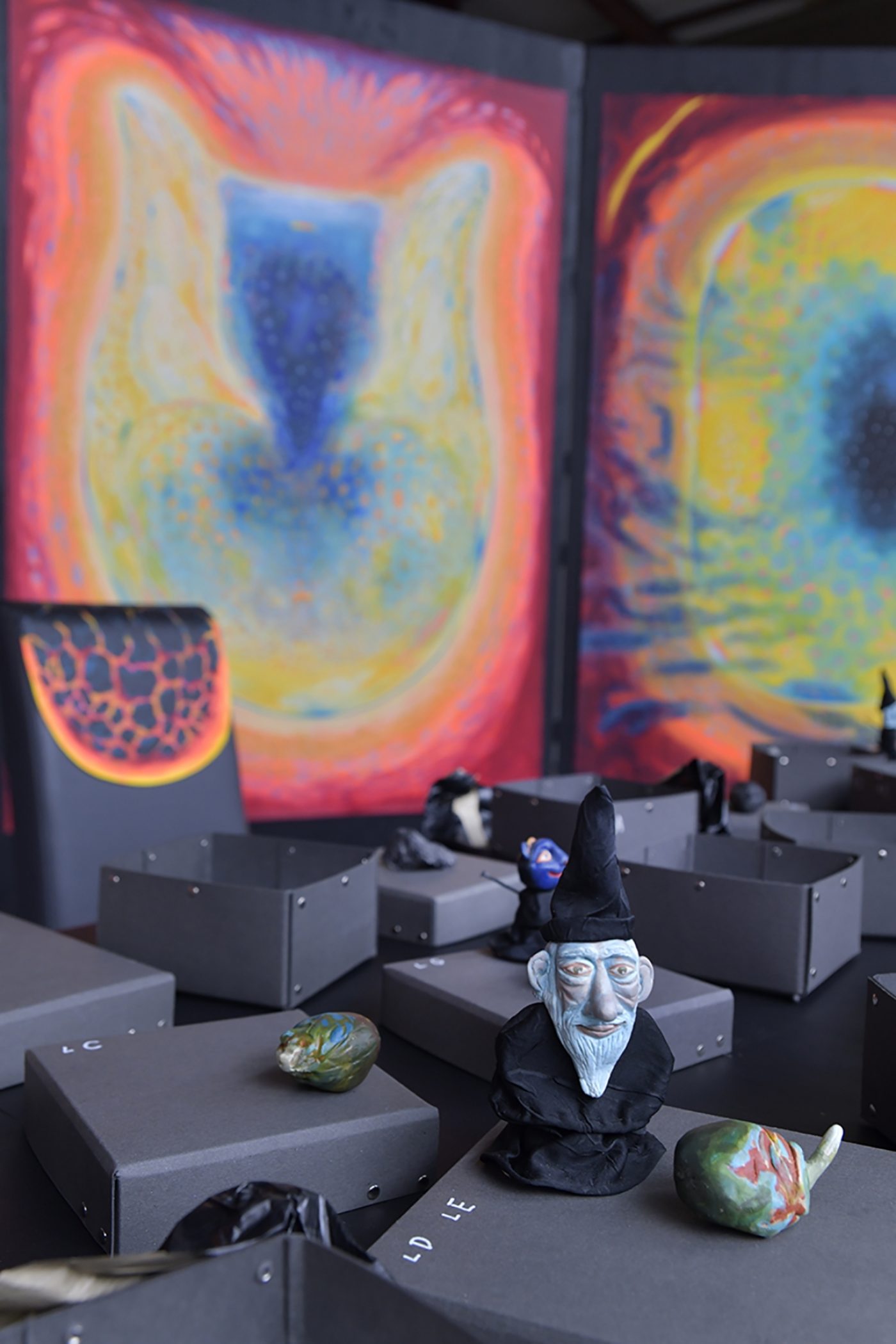 Herbert Kopainig (*1952, lebt und arbeitet in Diessenhofen) und René Schmalz (*1957, lebt und arbeitet in Gottlieben) zeigen an der Werkschau die installative und vielteilige Arbeit Matrix-Mensa (2019). Wie sie sagen, „ein Wunderkammerspiel mit Kunstmitteln des Environments, der Performance und des Tanzes“. Während Herbert Kopainig seit Mitte der 1970er-Jahre ein eigenständiges künstlerisches Universum als Environment aus Malerei, Objekten, Texten, Videos oder Fotografien entwickelt, in dem er mit seinem Alter Ego Elias Wundersam agiert, legt René Schmalz seinen künstlerischen Fokus auf Tanz und Performance. In MATRIX-MENSA kommen diese Disziplinen zusammen. Dabei verbindet die zwei Künstler nicht nur ihre Auseinandersetzung mit Archetypus, Fiktion, Mysterium und Bewegung, sondern auch das Spiel mit der Verschmelzung von Kunst und Leben. Ausgehend von der Idee der Wunderkammer als Raritäten- und Kunstkabinett (der griechische Ausdruck hierfür ist ‚Panoptikum’, das als etymologische Kombination der Begriffe ‚alles’ und ‚zum Sehenden gehörend’ in der künstlerischen Narration von Herbert Kopainig eine zentrale Rolle spielt), präsentieren sie Objekte unterschiedlicher Herkunft und Bestimmung dicht nebeneinander. Auf einem ‚Grand table à manger’ inszenieren Wundersam & Schmalz allerlei alchemistische Substanzen zusammen mit Lebensmitteln: Kohlen, Steine im Schafspelz, Brot und Wein. Das Dinner steht bereit, von Karfunkeln sanft beleuchtet. Das ausgelegte Szenarium der MATRIX-MENSAversammelt Speisen für die Seele, die uns zu Tisch laden.