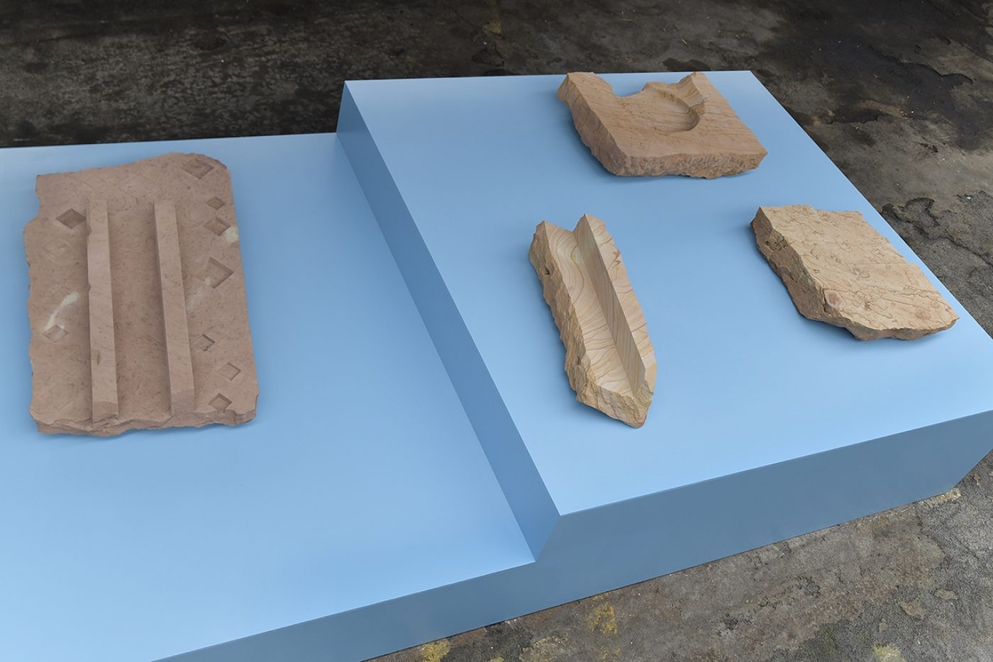 Peter Kamm (*1958, lebt und arbeitet in St. Gallen und in Arbon) setzt sich seit vielen Jahren künstlerisch mit Stein als Material auseinander. Seit Mitte der 1980er-Jahre arbeitet er ausschliesslich mit Sandstein und weiss sowohl um die Widerständigkeit als auch um die Feinheit dieser Gesteinsart. Dabei interessiert sich der Künstler weniger für eine Weiterführung kunsthistorisch tradierter Ikonografien als für die Entwicklung eines ganz eigenständigen Vokabulars. Entstanden aus der Beschäftigung beispielsweise mit Formen aus der Geologie oder der Paläontologie erinnern seine Steinskulpturen an Schwämme oder an Korallen, vielleicht aber auch an extraterrestrische Figuren, die uns fremd und vertraut zugleich sind. An der Werkschau zeigt Peter Kamm fünf Skulpturen aus Eifel- und Rorschacher Sandstein, die unterschiedliche Farbigkeiten aufweisen. Mit ihrer rauen, geradezu rohen Oberfläche scheinen die Skulpturen auf das Prozesshafte der künstlerischen Arbeit zu verweisen. Als plastische Formen erinnern sie an gigantische Versteinerungen und könnten gleichzeitig zum Leben erwachende Materie sein. Zwar aus einem einzigen Material geschaffen, haftet ihnen doch etwas Hybrides an, als wären sie eine Vermengung sowohl organischer als auch anorganischer Elemente, ja Körper. Die mal runden, mal eckigen, mal amorphen Einbuchtungen verstärken das narrative Potenzial der Werke und lassen uns rätseln. Sie scheinen wie Fundstücke – entsprungen aus der Vergangenheit oder aus der Zukunft.