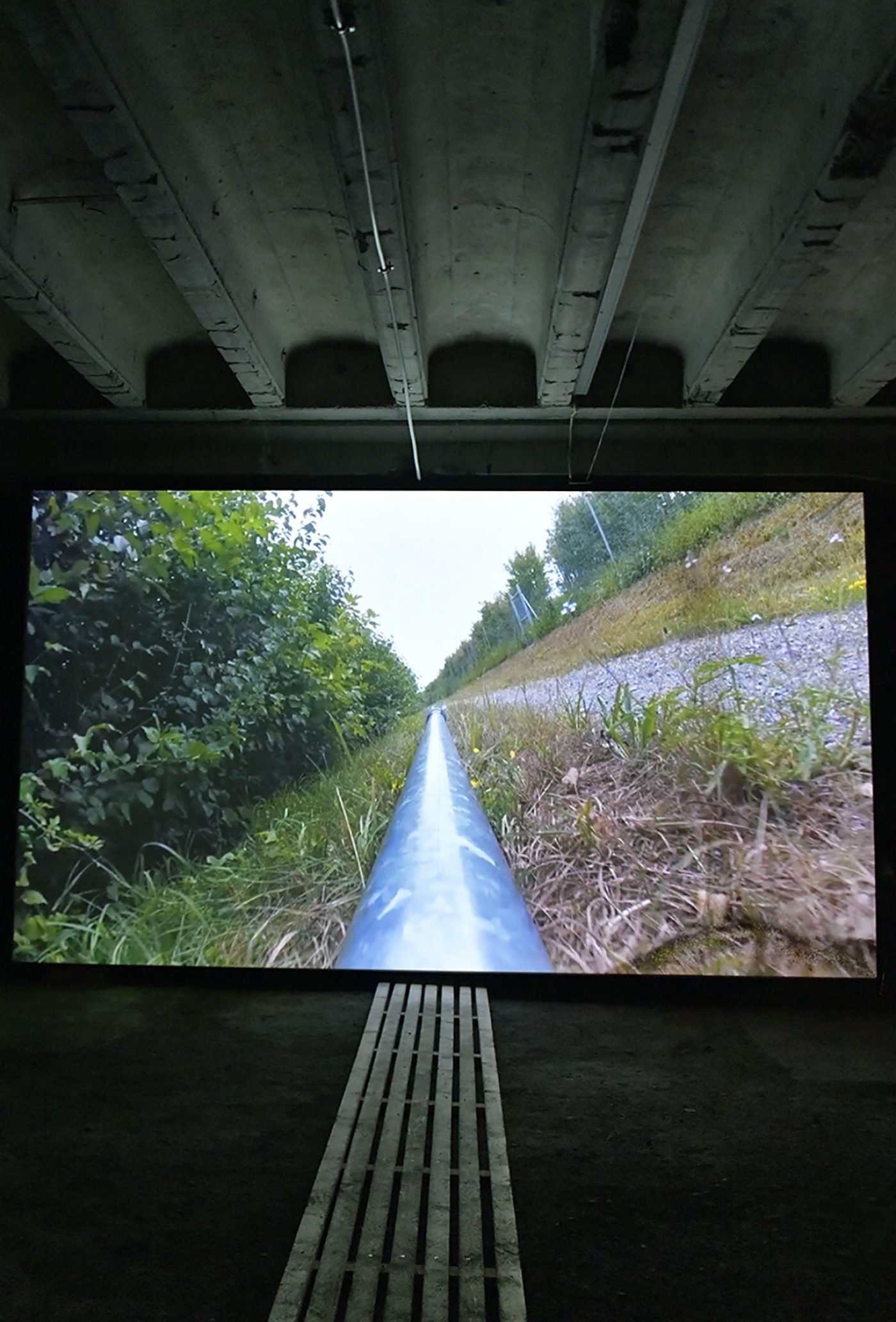 Christoph Rütimann (*1955, lebt und arbeitet in Müllheim) verbindet in seinen künstlerischen Arbeiten seit jeher Performances mit Objekten, Zeichnungen oder Videoarbeiten. Geprägt von der künstlerischen Aufbruchsstimmung in Luzern, wo er in den 1970er-Jahren studiert hat, verwischt er mühelos die Grenzen zwischen den Genres. Er spielt leise Musikpartituren auf den Stacheln eines Kaktus oder schafft grossformatige, ja riesige Zeichnungen. An der Werkschau zeigt er die Arbeit Eine Einigelung unterwegs(2018/19), die sowohl Objekt als auch Performance ist. Die aus grobem Abfallholz genagelte und für das Berner Performancefestival Bone konzipierte Holzkugel ist gleichsam um den Künstler herum gewachsen, denn: „Genagelt wird von innen nach aussen.“ Nach der Überwinterung in Frauenfeld vor dem Büro der Kulturstiftung rollt Christoph Rütimann nun anlässlich der Vernissage der Werkschau in der Kugel in die Kunsthalle Arbon hinein. Dazu sagt er: „Die Kugel wird gerollt. Sie eignet sich Schichten (Geschichten) an, ähnlich einer Schneekugel (Schneeball). Diese Schichten bilden sich aussen. Im Inneren werden Schichten (Innenausbau) während meinen unterschiedlichen Aufenthalten realisiert. All diese Ablagerungen ergeben sich durch die Orte, an denen gearbeitet wird, und auf den Wegen, die die Kugel hinter sich legt.“ Die während der Performance entstandenen Videoaufnahmen vermitteln uns den Zustand der Einigelung, nun blicken wir durch die groben Holzlatten nach draussen. Auch in der Videoarbeit Handlauf Wasser (2018) geht es um Bewegung, um das Unterwegssein. Die Kamera rast auf den Bewässerungsrohren vom Thurkanal durch das Unterholz, fast spüren wir die Grashalme und Blätter im Gesicht.