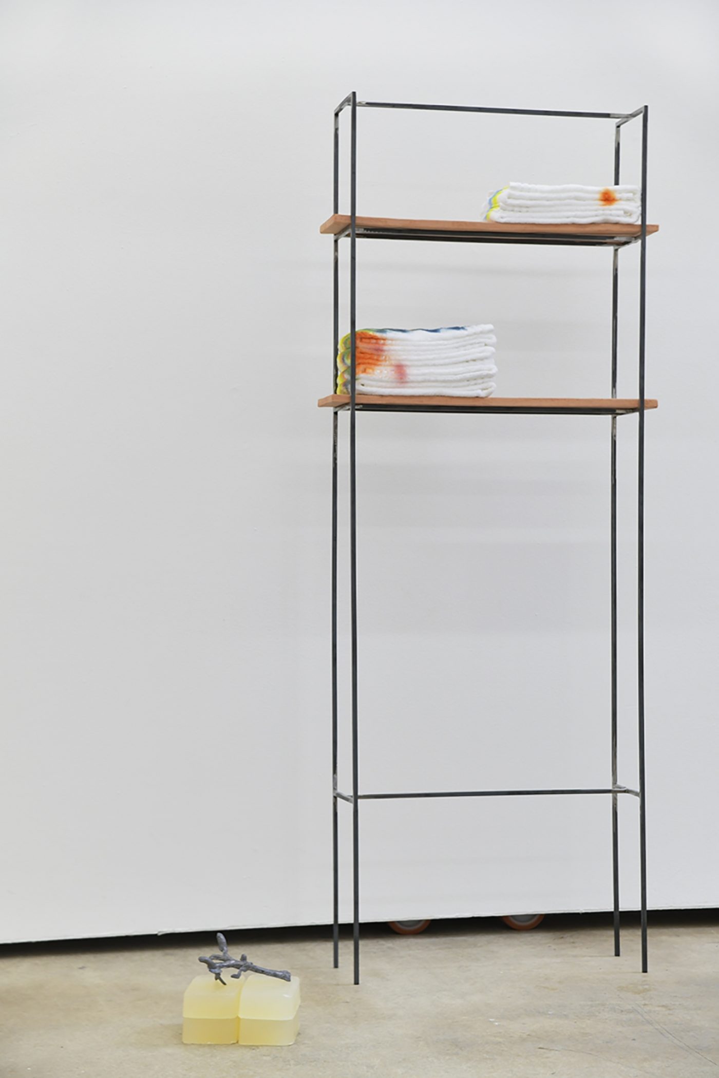 Angetrieben von einer Faszination für die Häuser, Wohnungen und Interieurs, in denen wir uns bewegen, entwickelt Martina Böttiger (*1980, lebt und arbeitet in Basel und im Elsass) vor allem plastische und zeichnerische Arbeiten. Sie interessiert sich für die Gestaltung von Innenräumen, für die kulturellen und sozialen Botschaften, die wir damit bewusst oder unbewusst vermitteln. Mit schnellen Linien aus Öl, Tusche oder Acryl bringt sie die teilweise nur schemenhaften Umrisse eines Stuhls, eines Betts oder einer Lampe zu Papier. Für ihre Objekte nutzt die Künstlerin häufig glasierte oder unglasierte Keramik, also ein Material, das in der Form von Gebrauchs- oder Ziergegenständen seit jeher auch in Privaträumen zu finden ist. Oft bleiben die Spuren der Arbeitsprozesse sichtbar: Die Glasur läuft über die Kanten hinaus, die Fingerabdrücke der Künstlerin sind sichtbar. An der Werkschau zeigt sie ihre installative Arbeit Eine Szene aus einem Lesben-Detektivroman. Es war 15h (2018). Wir sehen ein Regal, darauf verteilt herkömmliche Handtücher aus Frottee mit Farbflecken, ein Keramikobjekt, Stücke von Glyzerinseife. Irgendetwas ist hier geschehen, in diesem überaus seltsamen Interieur. Der Werktitel suggeriert eine Geschichte und eine kriminalistische Situation zugleich. Wohl mag die Erzählung fiktiv sein, dennoch regt sie unsere Fantasie an, und wir versuchen in den Farbverläufen auf den Frotteetüchern Spuren zu lesen. „Die Dinge, mit denen wir uns umgeben, wissen weit mehr von uns, als wir denken, und nicht in jedem Haus sind wir die gleichen Menschen“, sagt Martina Böttiger dazu.