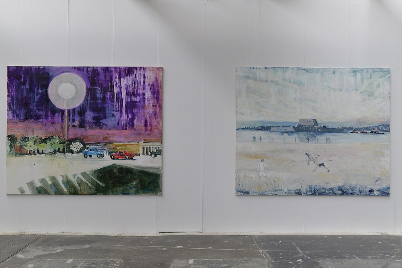 Rachel Lumsden (*1968, lebt und arbeitet in St. Gallen und Arbon) malt meist grossformatige Gemälde mit Ölfarbe, die zwischen Gegenständlichkeit und Abstraktion oszillieren. Obschon wir Figuren, Landschaften und Gegenstände erkennen können, bieten ihre Bildfindungen auch Raum für das Ungefähre, das Spekulative: Gesichter sind nur angedeutet, der Ausblick aus einem Fenster verliert sich in der Unschärfe. Dabei beginnt der Malprozess für die Künstlerin direkt auf der Leinwand. „Ich warte nicht auf Inspiration“, sagt sie dazu, „ich will, dass ein Bild auf der Leinwand entsteht, nicht in meinem Kopf. Es ist immer ein Abenteuer, weil man nie genau weiss, wo man landen wird.“ Sie trägt die Farbe mal pastos, mal lasierend auf, giesst sie aber auch auf die Leinwand, um eben dem Unerwarteten, dem Unkontrollierten Raum zu geben. Sie übermalt und korrigiert, beginnt an einer Stelle und arbeitet an einer anderen weiter. Und plötzlich, so Rachel Lumsden, „steht das Bild vor dir, wie eine eigenständige Persönlichkeit“. In Violett und Rosa scheint sich der Mitternachtshimmel auf Midnight folk (1) (2018) über die Leinwand zu giessen, mehr als die Hälfte der Bildfläche einnehmend und in rauen Pinselstrichen gemalt. Der Blick bleibt am Lichtkegel der Strassenlampe hängen, hellrosa und rund. Derweil rennen auf In from the blue (2) (2018) Läufer am Strand, leicht und ekstatisch wie Möwen vor dem verwischten Horizont, wo grosse Schiffe kreuzen.