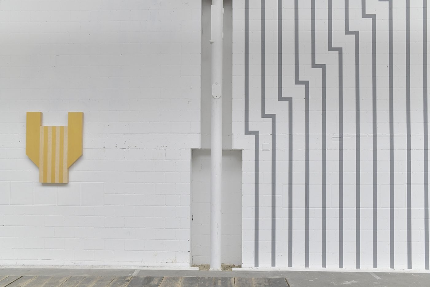 Ausgebildet an der École Cantonale d’Art (ECAL) in Lausanne und an der Basler Hochschule für Gestaltung und Kunst setzt sich Almira Medaric (*1992, lebt und arbeitet in Frauenfeld) insbesondere mit der Geometrie auseinander, die ihr in ihrer künstlerischen Arbeit als Medium und als Inspirationsquelle dient. Dabei interessiert sie sich nicht nur für die kunsthistorische Bedeutung geometrischer Formen beispielsweise in der konstruktiv-konkreten Kunst oder in der Architektur- und Designgeschichte – einer Tradition also, die gerade in der Schweiz von grosser Bedeutung ist –, sondern spürt auch den mitunter zufälligen Geometrien im Alltag nach: dem Muster einer Tapete vielleicht oder den Linien eines Kleides. Ausgehend von dieser Faszination hat die Künstlerin ein Regelsystem aus diagonalen, vertikalen und horizontalen Linien entwickelt, nach dem sie ihre Objekte, Malereien oder Zeichnungen konzipiert. Oft schafft sie eigentliche Environments, in denen sie auch Designmöbel platziert und gekonnt mit der Auflösung der Grenzen zwischen Kunst und Design spielt. An der Werkschau zeigt Almira Medaric eine eigens für den Shed im Eisenwerk entwickelte Wandmalerei sowie Arbeiten aus Holz, die aus ihrer Auseinandersetzung mit Superheld*innen entstanden sind. So hat die Künstlerin ihre Recherche nach geometrischen Formen in letzter Zeit immer mehr auch auf die Populärkultur ausgeweitet und ist in Science-Fiction-Filmen oder Comics fündig geworden. Diana (2017), Tony(2016) oder Jean (2017) sind aus einer Abstraktion des Logos oder der Maske der jeweiligen Superheld*innen entstanden: Vertraut mit den Insignien der Popkultur dieser Figuren erkennen wir sie vielleicht wieder – Batman oder Wonder Woman.