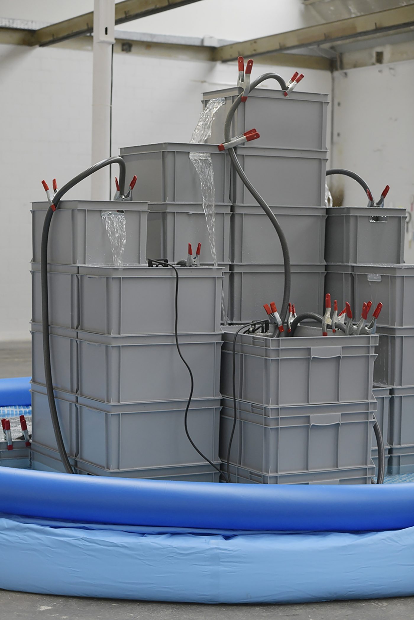 Sara Widmer (*1980, Zürich) und Daniel Lütolf (*1980, Zürich) arbeiten seit 2012 als Kollektiv CKÖ zusammen. Ihre Objekte und Kunst-und-Bau-Projekte entstehen in ebenso lustvollen und poetischen wie ernsthaften Rechercheprozessen. In der Auseinandersetzung beispielsweise mit architektonischen Elementen oder alltäglichen Gebrauchsgegenständen kreieren sie subtile Verschiebungen oder augenfällige Interventionen, die meist einen direkten Ortsbezug aufweisen. So haben die zwei Kunstschaffenden beispielsweise 2018 in der Kunsthalle Arbon die Installation GRRRNRRRRG konzipiert – eine Art Aussichtsplattform im Ausstellungsraum, die die Blicke der Besucher*innen in ungewohnte Richtungen lenkte, derweil sie mit TFONTF (2018) im Kunstraum Aarau einen Raum-im-Raum aus Gipskarton formten, der unsere herkömmliche Wahrnehmung irritierte. An der Werkschau 2019 zeigen sie die PSCHSCHSCH FOUNTAIN (2018), einen aus einem aufblasbaren Gummiplanschbecken und grauen Kunststoffboxen gefertigten Brunnen. Das Wasser wird mit Hilfe von Schmutzwasserpumpen in einem geschlossenen Kreislauf bewegt. Dabei sind die Pumpen und die Behälter so austariert, dass der Pumpmechanismus in regelmässigen Abständen innehält und der Kreislauf für einen Moment stillsteht. Was im Ausstellungsraum auch als eine rauschende und plätschernde akustische Kulisse funktioniert, erinnert durch den Titel zugleich unweigerlich an das im gängigen Kanon Marcel Duchamp zugeschriebene Urinal Fountain von 1917 (aktuelle kunsthistorische Recherchen legen nahe, dass die Urheberschaft wohl bei der Künstlerin Elsa von Freytag-Loringhoven liegt – aber das ist eine andere Geschichte), das als Readymade die damals herrschenden Vorstellungen von Kunst gründlich auf den Kopf stellte.