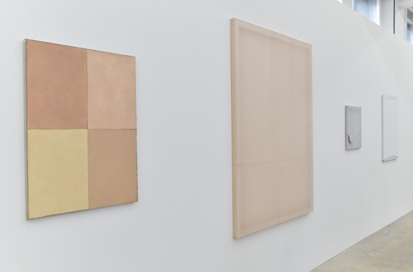 Die Auseinandersetzung mit der Malerei und insbesondere mit dem eigentlichen Bildkörper – also den Bestandteilen der Leinwand – treibt Karin Schwarzbek (*1969, lebt und arbeitet in Zürich) um. Sie faltet, schneidet und vernäht Leinwände oder arbeitet mit dem Holz der Keilrahmen. Zugleich ist auch der menschliche Körper – und dabei, so behaupte ich, immer wieder der weibliche Körper – in ihren Arbeiten präsent. Karin Schwarzbek schneidet beispielsweise aus mit Emaillack beschichteten Leinwänden schnittmusterähnliche Formen oder näht einen oft für Arbeitskleidung verwendeten leuchtorangen Stoff in die Leinwand ein. An der Werkschau zeigt sie eine Auswahl von ganz neuen Arbeiten, die ebenfalls um diese Thematik kreisen. Für 153 (2018/19) – seit 2015 nummeriert Karin Schwarzbek ihre Werke durchgehend – hat sie ein von ihr entfärbtes Leinenkleid, das noch die Abdrücke der Wäscheleine aufweist, auf einen Keilrahmen gespannt. In 156(2019) verwendet sie einen glänzend schimmernden Unterrockstoff, dessen Naht die Spannkraft des Keilrahmens offenbart. Neben ihrer Faszination für Stoffe und Kleider – also gleichsam für die Schutzhülle des menschlichen Körpers – interessiert sich die Künstlerin auch für die ganz unmittelbare Körperoberfläche. So hat sie sich beispielsweise mit der traditionellen Technik des Inkarnats – also der tradierten malerischen Darstellung von Hauttönen – befasst. In 161 (2019) transformiert sie diese Technik in die Gegenwart und nutzt verschiedene Make-up-Sorten, um Leinwände einzufärben, die sie anschliessend zusammennäht. Das so entstandene vierteilige Gemälde zeigt ein breites Spektrum von Hauttönen und erinnert uns daran, dass der Hautfarbe immer auch ein politisches Moment anhaftet.